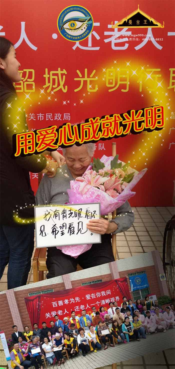 2014年3月29日,曼古王配合广东狮子会的蓝海之光服务队,远赴广东韶关福利院,去为在这间福利院中的数百名老年同胞,尽一份我们微薄的心意。这一次的活动是由广东狮子会所发起的,目的是帮助患有白内障的老人动手术,回复老人的视力得见光明,而快乐的享度晚年。曼古王和其他企业一样,愿意集合大家的力量,来为这些孤苦的老人做一些事。