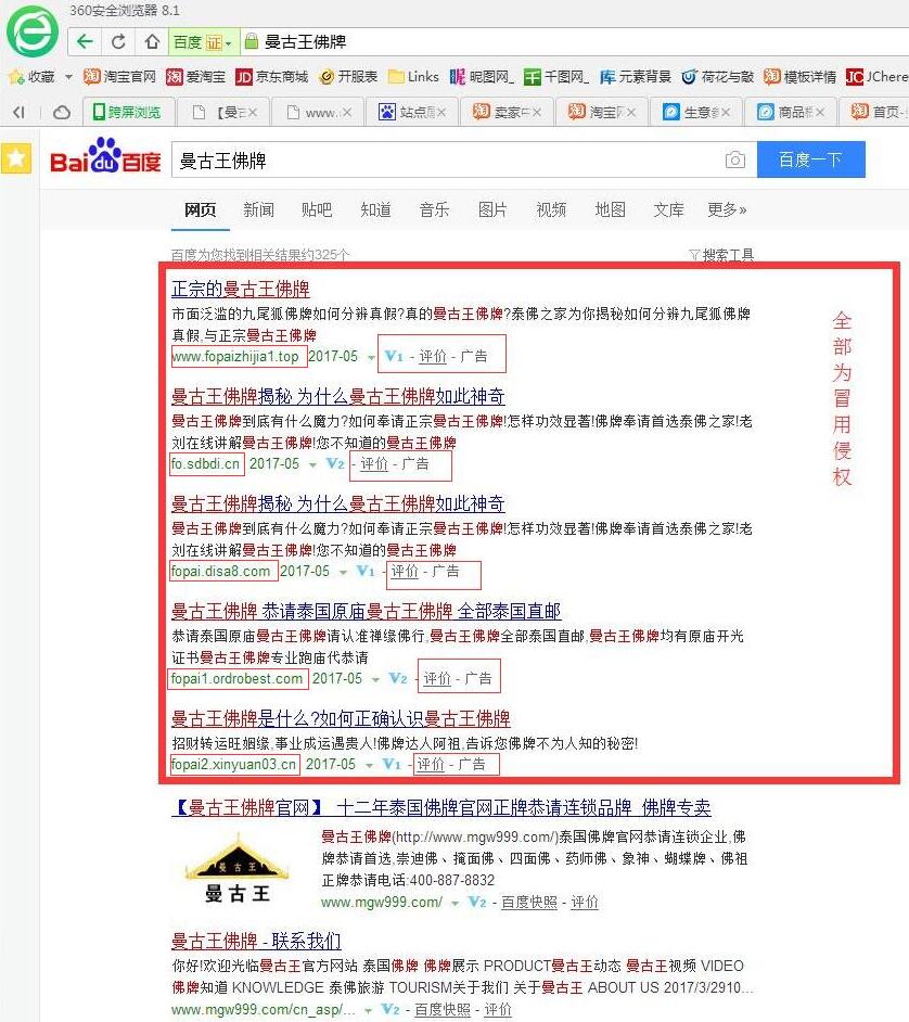 今年3月起,公司网络部门陆续发现百度搜索中有大量同行恶意冒用我曼古王品牌的情况,曼古王公司已经向百度公司申明商标权利,并将追究相关侵权方责任,请广大相信曼古王的朋友擦亮眼睛,曼古王作为行业内龙头牌商一直不遗余力的传承泰佛文化,我们鄙视同行间的不正当竞争,鄙视一切欺骗善信的行为,请广大朋友认准曼古王商标以及官方网址www.mgw999.com 曼古王官方客服电话:400-887-8832 曼古王公司口号:时间可证明一切!