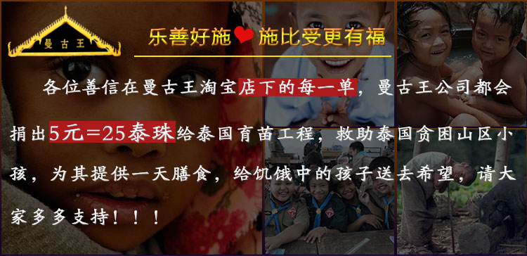 曼古王在不断巩固企业基石的同时,也不忘回馈社会,履行社会责任,善信们在曼古王淘宝店每恭请以及预约一单,曼古王将向泰国育苗工程捐出5元人民币=25泰铢,救助泰国山区中的贫困儿童,为他们免费提供一天膳食,给饥饿中的孩子送去希望,请大家多多支持!