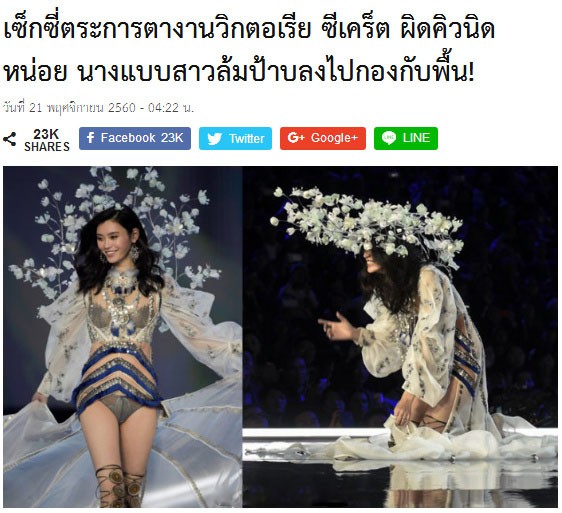 11月20日晚,2017维密秀在上海如期举行。绚丽灯光下国内外众维密天使闪亮登场,但在走秀环节中国名模奚梦瑶不慎跌倒,此事件吸引了泰国媒体的高度关注。泰国媒体赞名模奚梦瑶跌倒后仍不忘露出得体的微笑实在难得,还特别称赞扶起奚梦瑶的巴西籍女模特,她扶起奚梦瑶后主动让奚梦瑶先走,小小善举被全世界看在眼里,泰国媒体表示为她们俩“骄傲”!