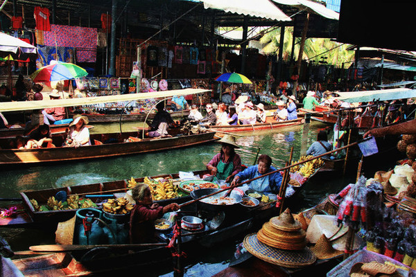 进入水上市场先要乘坐小船,在小船慢悠悠的摇晃中,穿过一座座小桥,边游边看,两侧布满了各种各样的摊位,数不胜数。走一走,看一看,悠然自得。