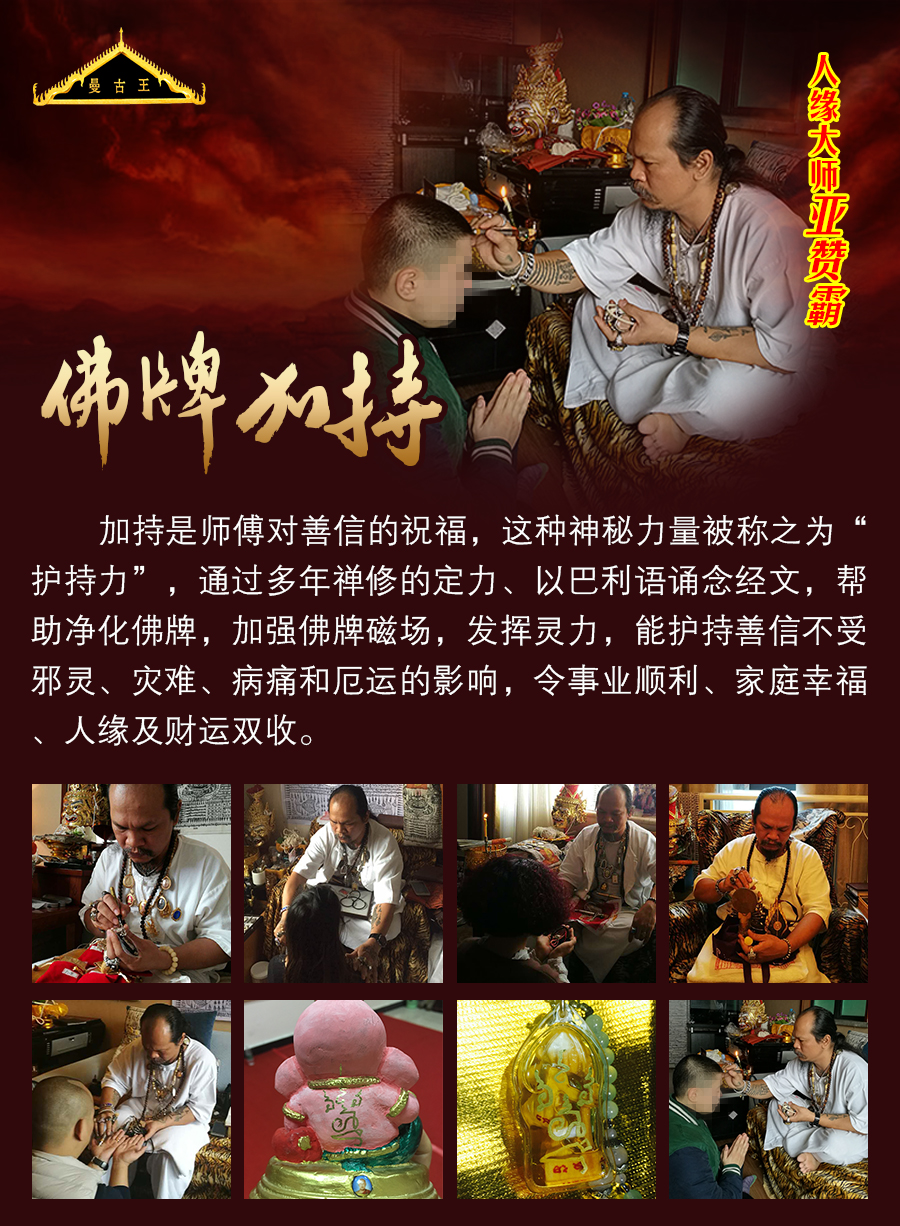 佛牌加持,通俗来讲就是师傅对善信的祝福,这种神秘力量被称为“护持力”。师傅通过多年禅修的定力、以巴利语诵念经文,帮助净化佛牌,加强佛牌磁场,发挥灵力,能护持善信不受邪灵、灾难、病痛和厄运的影响,令事业顺利、家庭和睦、人缘及财运双收到!