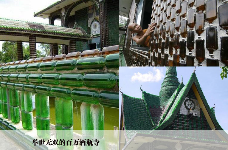 万瓶寺,地处泰国东北部的四色菊府的郊外,寺庙僧人从1984年起就开始收集酒瓶。在集到将近100万个酒瓶后,他们便着手兴建新的宝塔和寺庙。尽管在佛教上认为饮酒是一种罪孽,但僧人们一向是支持及提倡环保,使用旧物回收来的废旧酒瓶建造寺庙想法新颖空前,待万瓶寺建成后前去参观的人络绎不绝,它象征着人类灵魂的一次净化,已被列入了“东南亚地区环保旅游景点”名单中。