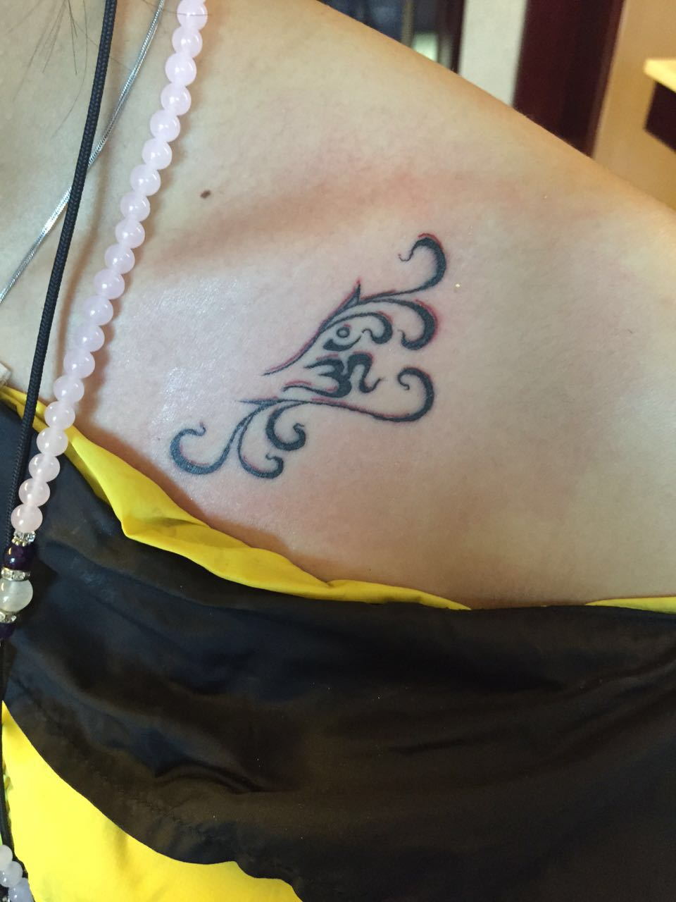 OM作为一个最简单最原始的声音,在瑜伽世界里它被符号化,是一个代表整个瑜伽世界的符号。OM就是一个从声音延伸出的符号,并被赋予了一个至高无上的意义。OM是所有唱颂(Mantra)中最有力量,也最能抚慰人心的一个。OM纹身可扫除内心一切的障碍到达三摩地。
