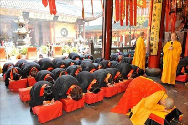我们在拜佛之前,应当先洗净身体及双手,须知此是拜佛的礼貌,表示为敬意,在吃食方面,拜佛前请勿吃食蒜、葱、鱼肉、酒,及嚼槟榔、吸烟草,而免口污臭;否则,对佛菩萨祷告是相当不敬的。在佛堂内,见有人跪地礼拜佛菩萨时,勿从前面经过,我们凡人是无福消受人家之礼拜。一个人拜佛心诚,他的拜佛姿势定庄严又肃穆,看了自令人起恭敬之心。合掌拜佛,定要双手十指并拢,不用力地靠着两胸部心窝处,十指朝天,不可倾斜指向佛,然后再进行跪拜。